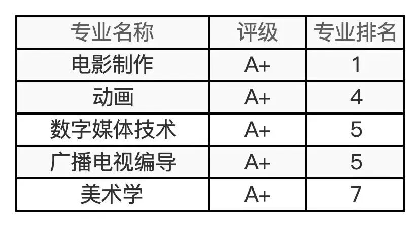 戏剧影视文学、广播电视编导、播音与主持艺术、动画、数字媒体艺术、录音艺术、影视摄影与制作、视觉传达设计、戏剧影视导演、戏剧影视美术设计、摄影、艺术与科技、音乐表演、环境设计